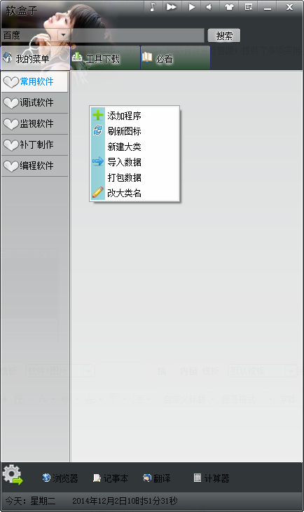 软盒子是一款类似于音速启动这样的快速启动软件。用户可以添加电脑中各类程序、链接到软件中,分门别类,能够有效进行管理;提供了多项实用小工具,如记事本、翻译、计算器等同时软件还提供了工具下载功能,包含了各类编程相关的工具,提供免费下载。