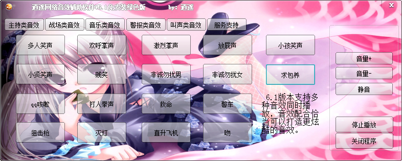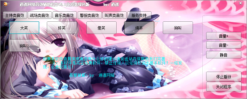 逍遥网络音效辅助软件是目前为止音效素材最多、最好用的一款音效辅助软件。软件提供了主持类音效、战场类音效、音乐类音效、警报类音效、叫声类音效等几大类音效。软件完全免费使用,同时可以自由调整音效的音量大小。