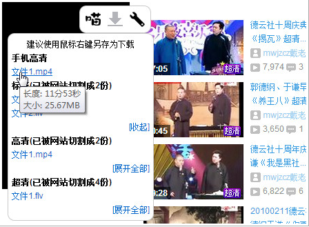 当您在优酷或土豆等网站看视频时,我们在页面插入一个按钮,您可以选择合适的清晰度进行下载.