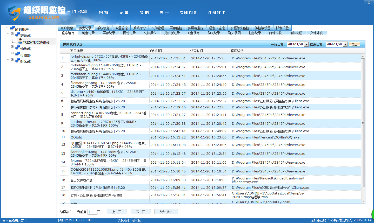 5、相关功能模块,使用记录监控, 文件管理,屏幕监控,上网行为管理功能设置等