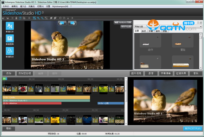 除了绚丽的界面,Ashampoo Slideshow Studio HD 3 包含了多个用户界面的改进,让您的工作更加智能和快捷。包括改进了物体的管理,自定义默认时间线,字幕风格,可调节头尾名单的移动方向,自动正常化音轨的音量,自动淡入淡出片头尾的音乐。为了增强体验,Ashampoo Slideshow Studio HD 3 还可以根据图片中包含的 EXIF 元数据自动插入文件名、大小及日期信息,这样您就不用自己输入了。
