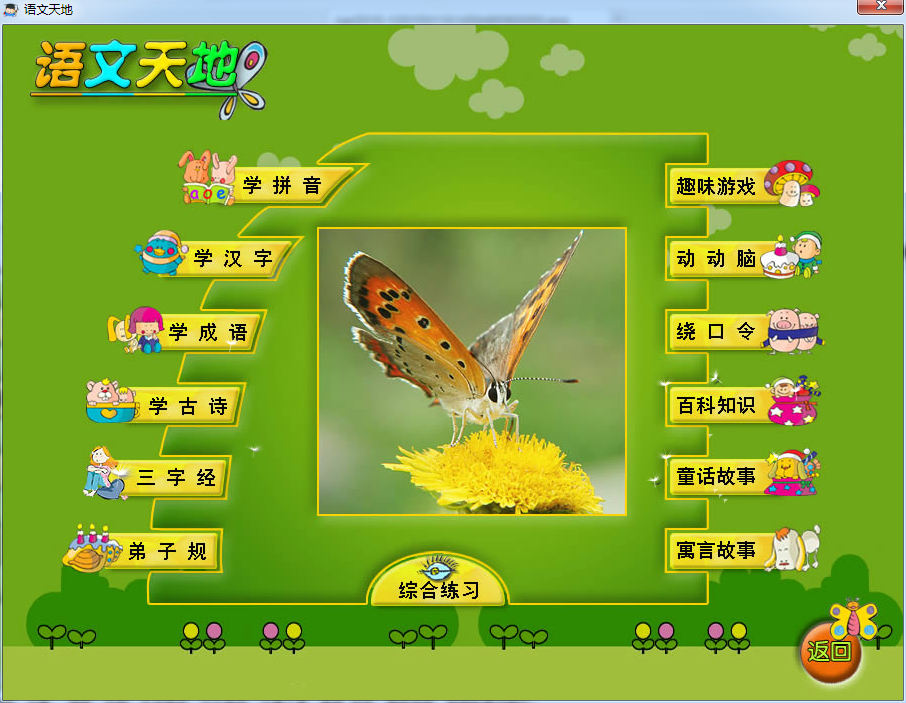 本模块囊括语文众多知识,包括:学拼音、学汉字、学成语、学古诗、三字经、弟子规、趣味游戏、绕口令、百科知识、童话故事、寓言故事及语文类的综合练习。