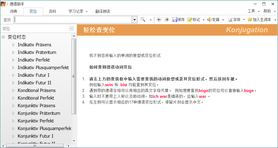 《德语助手》内置了德语18种时态的动词变位方法,支持一万余个常用动词的查询和反查,大大方便了德语初学者。同时整理不同时态的变位规则,帮助使用者尽快掌握德语动词变位。