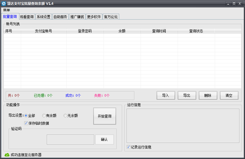 慧达支付宝批量查询余额工具可以用来查询多个支付宝小号账户余额。软件操作完全可视化,可以看到每一个帐号的余额、查询时间、查询状态等。同时软件可以根据查询结果,分类导出保存。