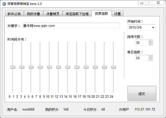 界面分六个模块,分别是【软件公告】【我的流量】【流量精灵】【淘宝指数下拉框】【百度指数】【设置】。