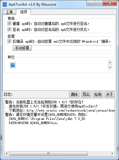 ApkToolkit是一款APK反编译工具,软件主要功能是对.apk文件进行反编译操作,根据反编译得到目录然后重建apk文件;同时还可以对于apk文件进行签名、优化。应用运行时,可以自动检测JDK6/7环境,强大的功能,可以算得上是一款APK反编译神器。