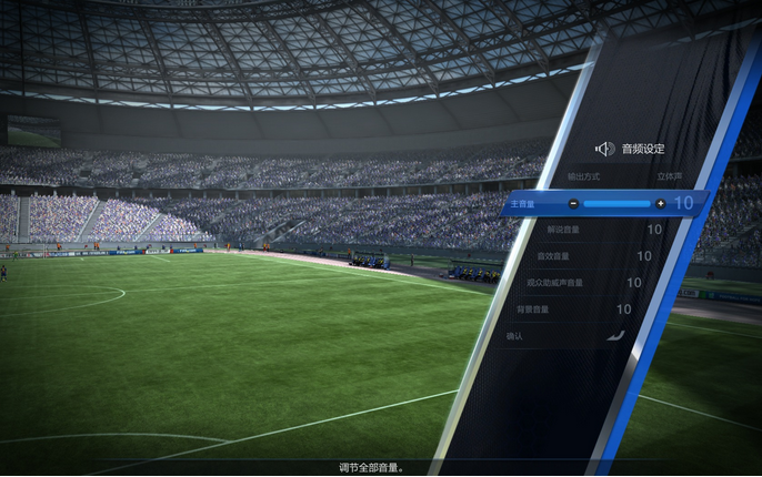 在音频设定菜单下,您可以根据个人喜好调整音频输出方式、主音量、解说音量、音效音量、观众助威声、背景音乐等。