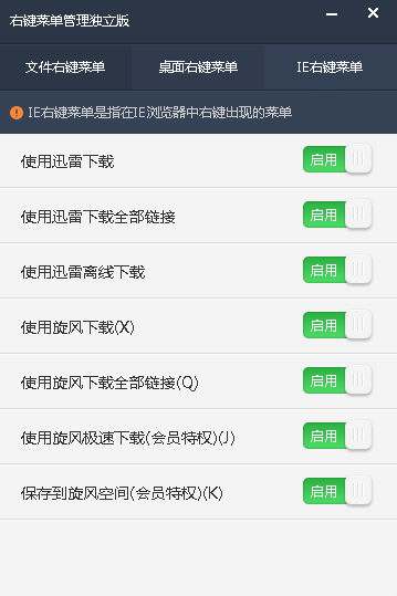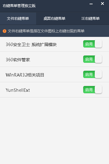 火绒右键菜单管理是从火绒互联网安全软件中独立提取出来的,本版本为绿色单文件版,具有文件右键菜单、桌面右键菜单以及IE右键菜单管理功能。