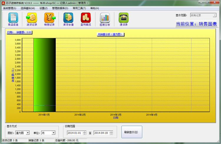 5、图表分析:对某时间段内所有商品的销售金额,按月或年以直方图或曲线图的方式直观的显示出来。