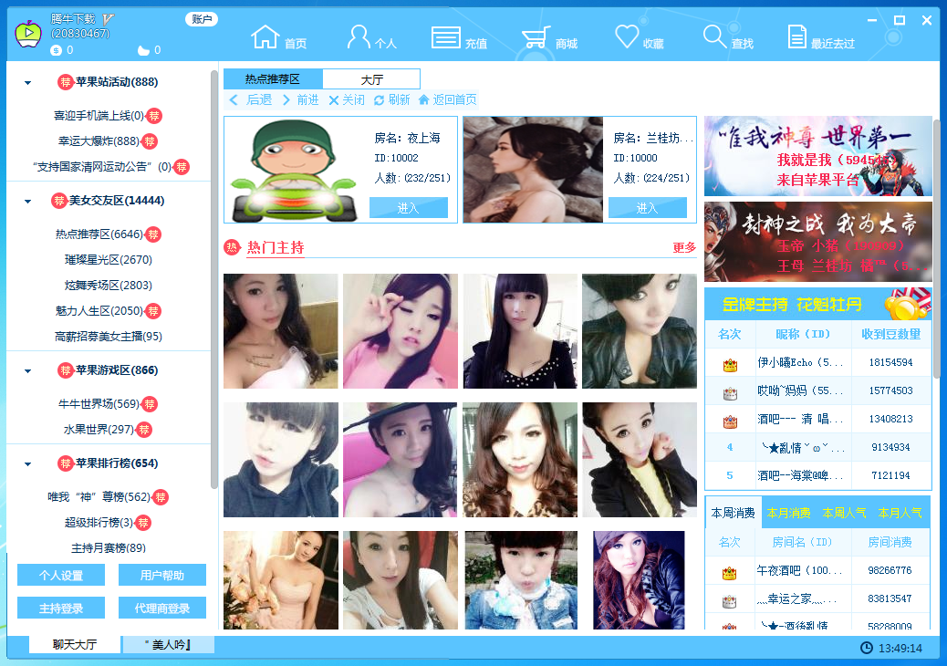 苹果视频社区2015是一款真人美女视频聊天室软件,为广大用户提供视频聊天交友、在线K歌等多项娱乐功能。聊天室采用多视频窗口查看方式,在进行视频聊天可以使用小喇叭、印章、礼物等道具与美女主播进行互动,为你带来有趣好玩的交友体验。