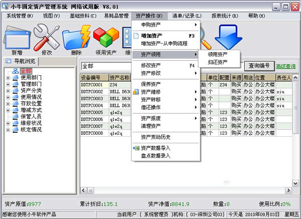 功能:提供资产(批量)增加、减少、变更、借出、维修、保养、折旧、统计……等管理