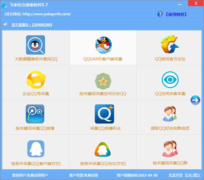 飞来综合搜索软件是一款专门针对QQ推广人员制作的QQ综合搜索软件,这款软件可以帮你批量采集QQ客户信息,目前他支持大数据精确条件查找QQ、youboy企业用户采集、QQGame客户端采集、QQ空间采集、网易邮箱采集、百姓网采集、QQ空间访客采集、百度搜索采集、QQ群号码采集、QQ好友和群成员采集、QQ客户端采集、QQ拍拍采集等众多信息,采集速度快、精确度高、资源广,是用户做营销、找意向客户的必备工具!