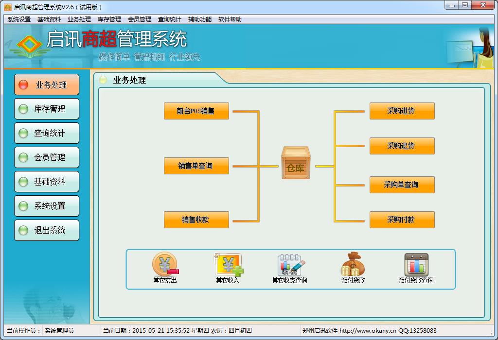启讯商超管理系统是一款专门为商店、超市设计制作的一款销售管理软件,这款软件集成了采购管理、销售管理、会员管理、查询统计等功能。系统以会员为中心具有会员积分、会员积分变动跟踪 、积分兑换。软件系统界面简洁、优美,简单易用,系统不用培训即可上手使用,以及各种查询、统计、分析等紧密结合起来,能满足如超市、日化店、母婴用品店、文具店、五金店等行业进行会员制管理,会员卡管理,会员积分管理,会员消费管理的需求,科学的管理方法会给您带来无限的效益。