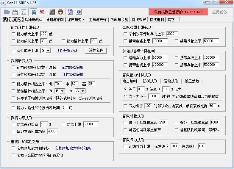 三国志11威力加强修改器是该款同名历史模拟类游戏——《三国志11:威力加强版》的辅助工具。这款三国志11威力加强版修改器能帮助玩家进行舌战、单挑、军事秒造、无限走、无限行动力等多项操作辅助,让你更轻松玩游戏!