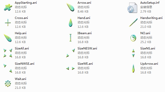 幽绿色彩鼠标指是一款绿色清新的指针样式,一套共有十五种,颜色是绿渐黄色为主,光标呈动态样式。