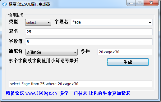 精易论坛SQL语句生成器可以方便快速的帮用户生成所需的SQL语句,软件功能强大,小巧实用,方便快捷,不仅支持SQL,还支持绝大部分大型数据库、中型数据库和小型数据库。