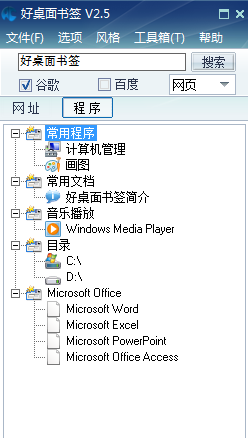 好桌面书签是一款拥有和QQ相似的漂亮界面,同样可以窗口置顶,而且也可以换皮肤,实用大方,并且完全免费的绿色桌面软件,可以方便快捷的打开我们需要的网址和程序,提高我们的效率。