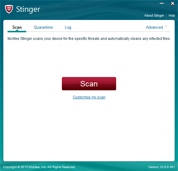 默认情况下,Stinger 会以最快的速度扫描 rootkits、后台进程、加载的模块、注册表和被电脑病毒感染的目录。