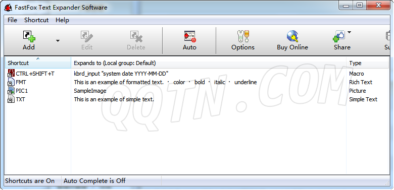 随着FastFox运行,只需输入您的快捷方式,它会自动扩大到你保存的文本。