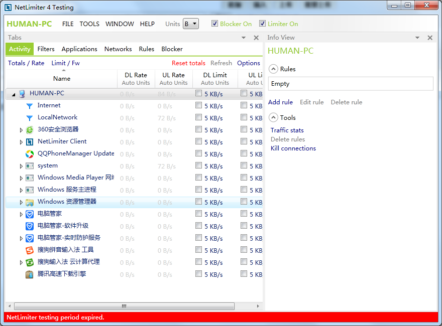 1、速度控制:NetLimiter可以为每个网络软件单独设置其下载/上传速度;