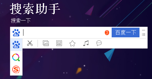 搜索助手主要提供了桌面搜索功能,集合百度搜索、360好搜以及搜狗搜索三大搜索引擎,此外还提供了实用小工具,精美壁纸等功能。