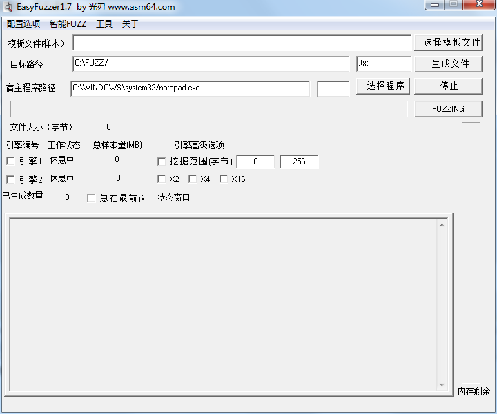 精简:为了容量和速度,软件采用100%汇编语言编写。排除了以往fuzzer的无用功能。绿色软件。