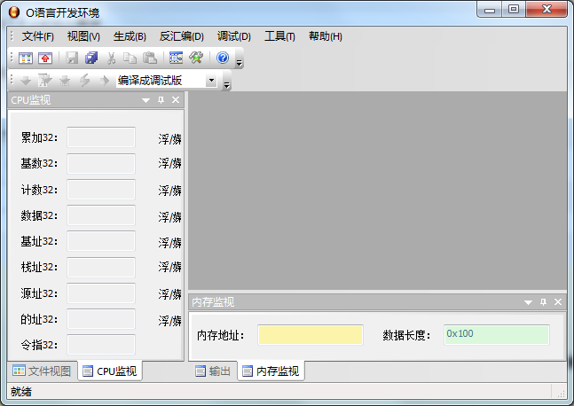 O语言开发环境这个套件内包含有链接、资源编辑、汇编代码编译、反汇编及支持调试功能的集成开发环境(IDE),IDE可以方便地调试现有O汇编程序、编写汇编代码或者进行中文反汇编其它程序。
