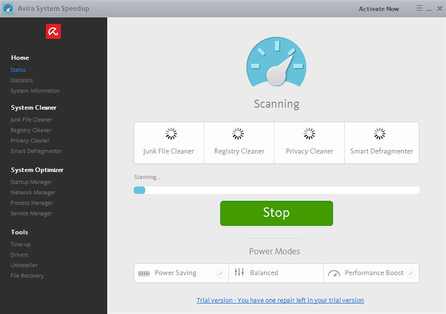 小红伞系统优化工具Avira System Speedup与其他系统优化工具的功能大致一样,主要包括一般的系统清理功能,如垃圾文件、注册表清理、隐私清理和磁盘碎片整理;系统优化优化加速,如开机启动项管理、网络状态监控、进程和服务管理;还有强大的工具箱,文件恢复、空文件夹重复文件夹清理、文件/文件夹备份、注册表备份与恢复、MBR备份与恢复、磁盘医生、IE管理等等。