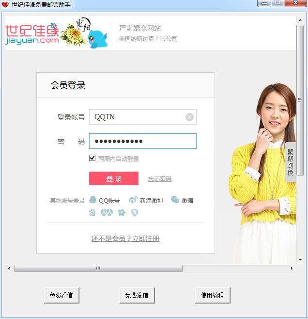 “世纪佳缘免费邮票助手”可以帮忙您查看收费的邮件、免费发送邮件给异性会员,软件永久免费使用。