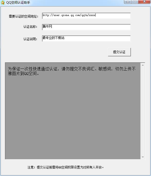 QQ空间认证助手可以辅助您完成认证过程,很好的解决了网站验证、填表信息、知名度等要求。正确操作可以确保您的QQ空间通过审核。