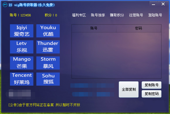 IS vip账号获取器是一款永久免费的各大视频网站vip会员账号获取器,这款软件可以帮助用户获得爱奇艺、迅雷、优酷、暴风影音等视频播放器的会员账号。软件操作简单、绿色免费,小编亲测可用,软件内的会员账号每半个小时更新一次,需要的可以来下载使用。