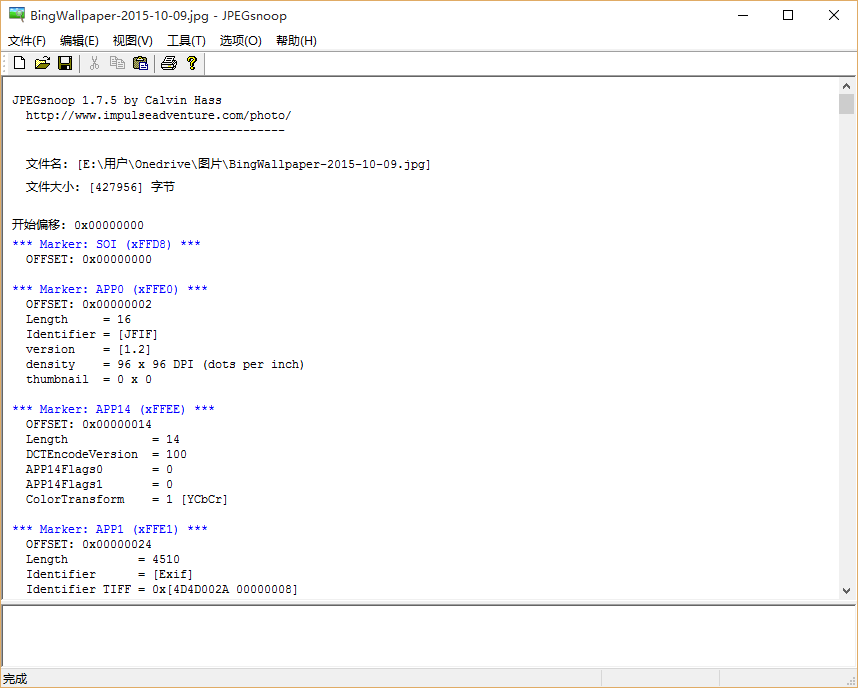 那么,JPEGsnoop 只要对这些信息进行检查,就能判断照片有没被修改过了。