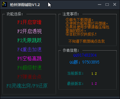 小男枪林弹雨辅助是为腾讯游戏枪林弹雨制作的一款游戏辅助工具。枪林弹雨是一款第一人称射击的娱乐游戏,辅助功能能帮你开启诸多有趣的小功能。