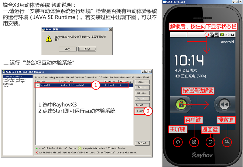 锐合x3互动体验系统是一款安卓模拟器,能够帮助用户在电脑上建立一个安卓系统,可以安装apk文件,完美模拟安卓手机。注意,安装该软件时,如果电脑上没有JAVA环境,它会帮助用户安装。