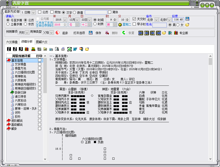 1、基本信息:文字排盘、六爻强弱对比图、用神取法、六亲取用、用神逐月强弱变化图、用神逐日强弱变化图、卦辞爻辞、诸爻持世、六亲发动、六神发动、原神·忌神·仇神、伏吟、反吟;