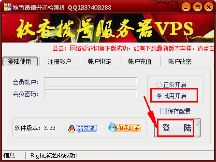 这款秋香微信开通检测机不注册,也可享受免费30分钟的试用期限,打开软件后选择“试用开启”即可,能够帮助用户批量查询各类手机号、QQ号、邮箱号是否开通微信。