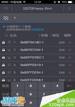 还在羡慕别人那些望尘莫及的分数吗?下面小编就为大家带来Flappy Bird修改器,有需要的小伙伴可以用用。很简单的几个步骤就能让你的分数让大家眼前一亮,快来围观吧。
