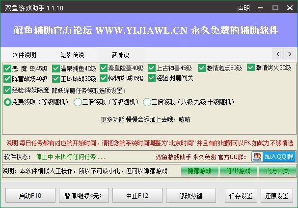 双鱼游戏助手是一款针对页游武神诀制作的游戏辅助,这款武神诀双鱼游戏助手辅助不仅简单好用,而且完全免费,它基于按键精灵开发制作,可以帮助你自动完成任务、自动副本、自动升级,让你摆脱手动操作的繁琐,解放双手,让游戏变得轻松愉快,欢迎喜欢玩武神诀的玩家试试这款双鱼游戏助手!