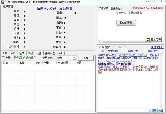 小白三国乱世辅助拥有主城、武将、征战、国战、兵器、cmd等各种修改选项,是三国乱世最好的小伙伴。