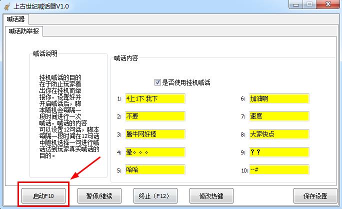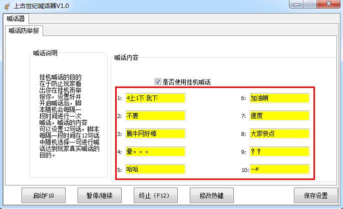 上古世纪喊话器是专为游戏上古世纪开发的一款自动喊话工具,它可以帮助你一键自动喊话,一共可以设置12句喊话内容,帮你在后台不间断自动喊话,防止其他玩家看出你在挂机而举报你,非常给力!