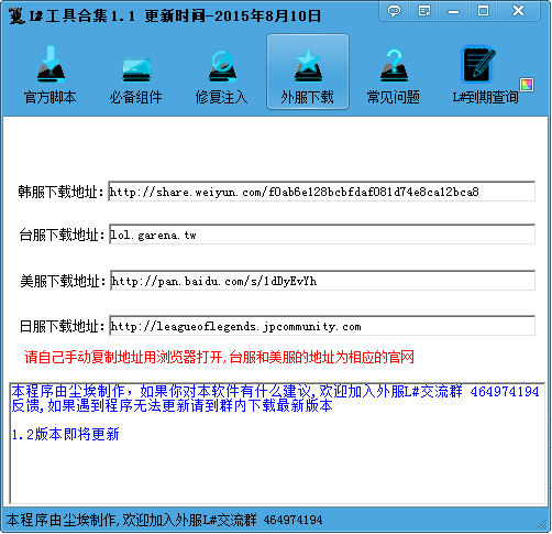 L#工具箱是是为英雄联盟制制作的一款辅助工具,集合了官方脚本、ADC脚本、中单脚本、辅助脚本、上单打野以及外服下载等。
