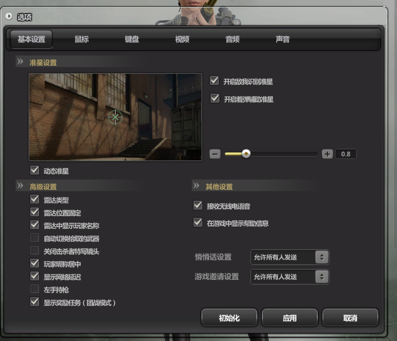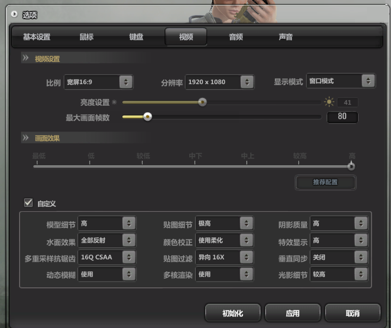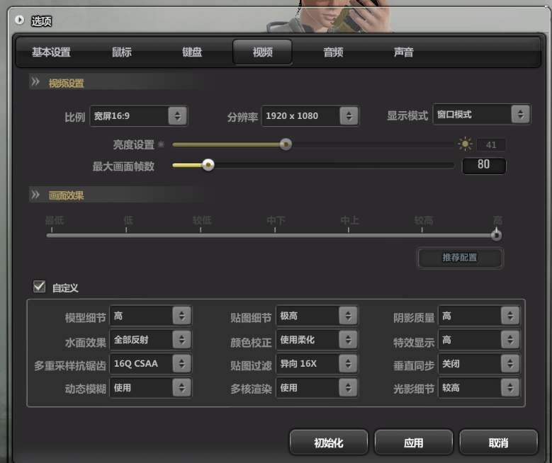 第一是高配视频模式,滚轮下跳上蹲,就是设置了很高的视频配置,本人显卡GTX760所以可以设置无压力,如果你觉得高配卡了可以自己调节为默认的,点下面的初始化,选择当前页面就行,不要选择全部,否则键位会失效。可能有窗口化