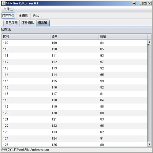 腾牛网提供的这款MHXSavEditor,是基于java语音为猎物怪人X制作的一款存档编辑器,可以直接修改存档中猎人的姓名、游戏时间、金钱和工会点数等信息,也可以对玩家背包和仓库进行逐个修改道具,不过道具一栏中没有以直观的形式而是以数字代码的形式显示,因此各位玩家需要通过对应后面给出的道具代码列表填入道具。
