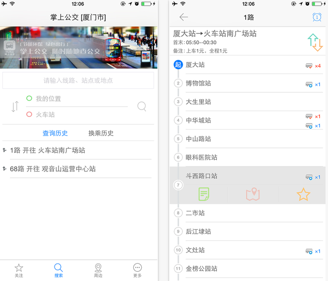 站点查询是以乘车站为中心,查询经过该站的所有线路及方向列表,用户选择线路及方向后,即可查询到经过该乘车站的最近一辆车的实时信息。