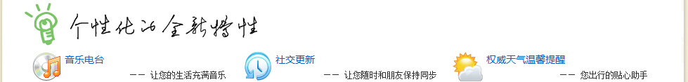 | MSN音乐电台可以帮助您在聊天的时候欣赏动听的音乐,您还可以收藏自已喜欢的音乐和制作专辑 | 无论是新浪还是微博上的好友,您都可以在最近新工具中看到好友的情况。 | 不要害怕天气多变,MSN全新的帖心助手为您提供最权威的天气提醒,为您的出行谋划策。 |