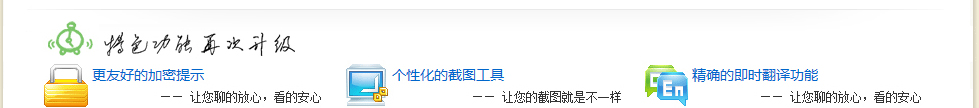 | MSN对聊天记录进行加密,让您的聊天更加的安全,保护您的信息不被第三方恶意盗去。随时告诉您现在处所的聊天状态。 | MSN非常个性化的抓图工具,轻松选定区域,立即抓图编辑,缤纷图形,超炫的文字,想加什么就可以加什么,轻轻松松作出只属于您自已的个性图片。 | MSN最大的特点就是国外的朋友多,您可以随时用外语和您的老外朋友聊天,在线即时翻译功能一定可以帮到您,再也不用担心一时忘记单词了。 |